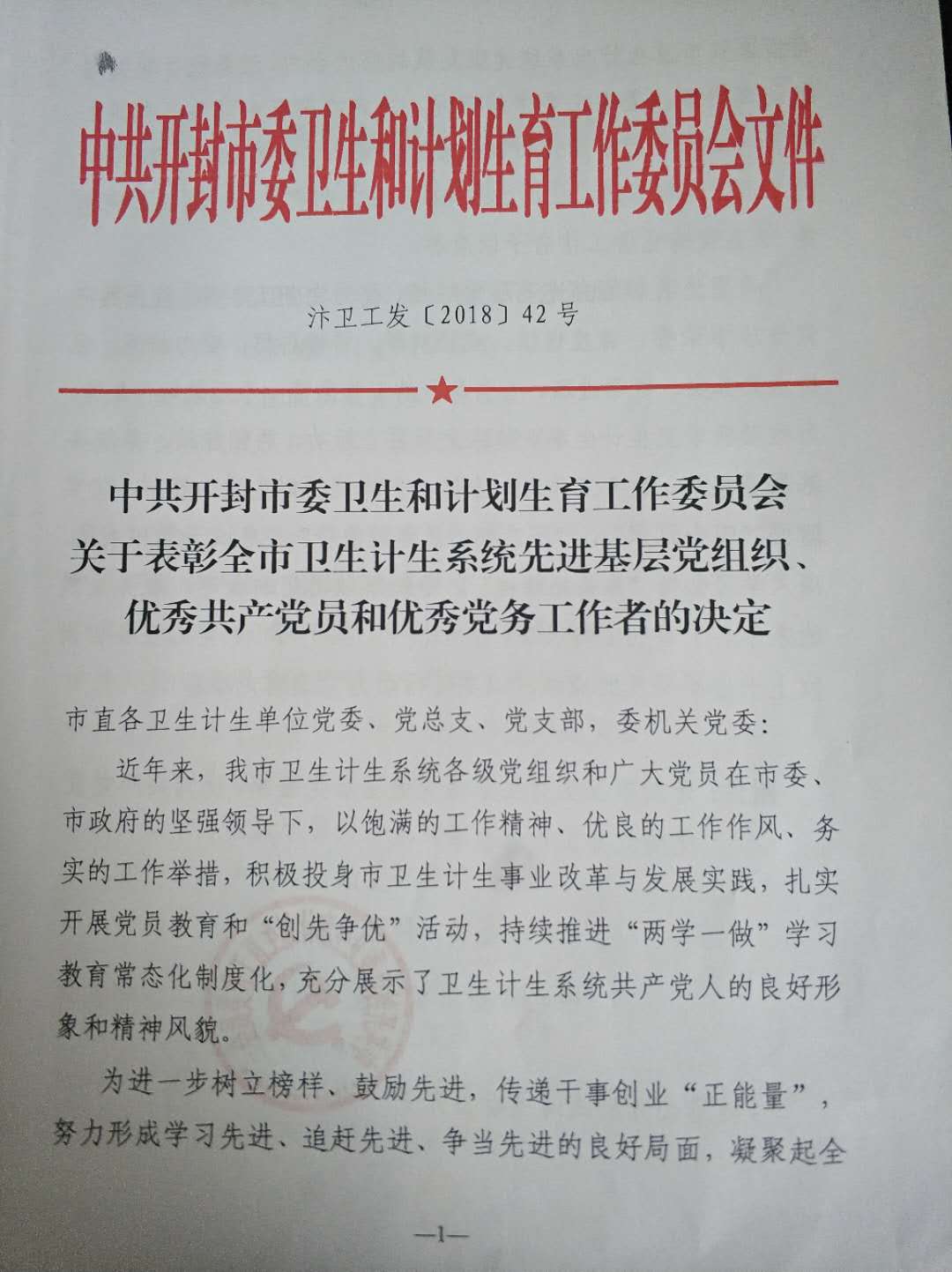 首頁 黨務工作 中共開封市委衛生和計劃生育工作委員會關于表彰全市衛生計生系統先進基層黨組織、優秀共產黨員和優秀黨務工作者的決定