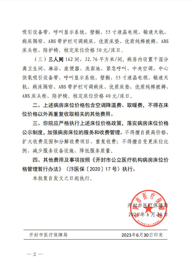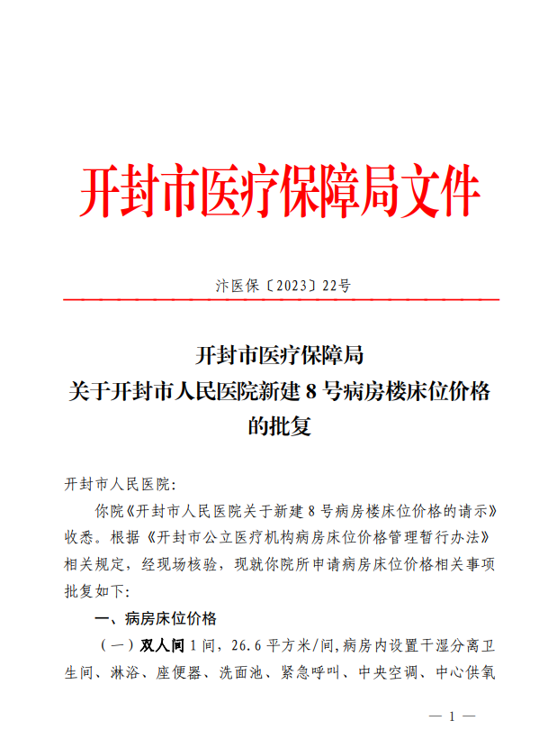開封市醫療保障局關于開封市人民醫院新建8號病房樓床位價格的批復
