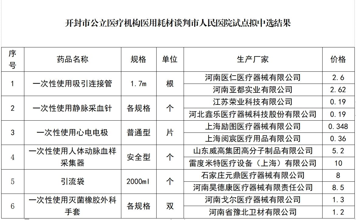 附件:開封市公立醫療機構醫用耗材談判市人民醫院試點擬中選結果